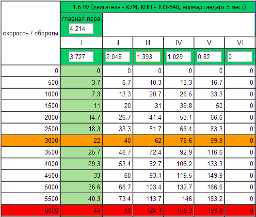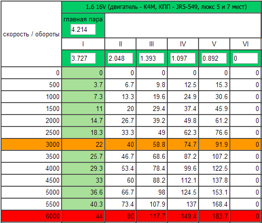 5 в обгоне не участвует, для обгона 3 или 4, иногда 2, пятая нужна что бы ехать равномерно и прямолинейно, в городе уже на 5 не поездишь, между 4 и 5 уже будет провал, если поставить шестерни на 115 км\ч то вообще провал, по этому и говорят что нужна 6 передача, но JR или JH коробки только 5 ступки. ИМНО два варианта, 5 на 105 или 5 на 115 но тогда и 4 надо поменять, тогда еще как то можно будет ездить Была и опять есть RS0Y5-42-02D 1.6 16v серебристая 7 мест, полный люкс | ||||||||||
