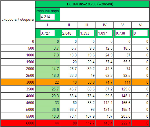 А это характеристики, которые можно получить на 1.6 16V Люкс при замене 5 передачи, +10 км/ч или +20 км/ч. Второй вариант по расчетным данным оптимальный, на 2500 об у нас ~90км/ч (согласно правилам), ну и при желании раскрутив двигатель до 3000 об мы получаем 110 км/ч. Единственно интересен переход с 4 на 5-ую на практике, возможно придется крутить на 4 до 3500 при переключении. Большая просьба уже прошедшим через это, описать свои ощущения!!! Прикрепленные файлы: