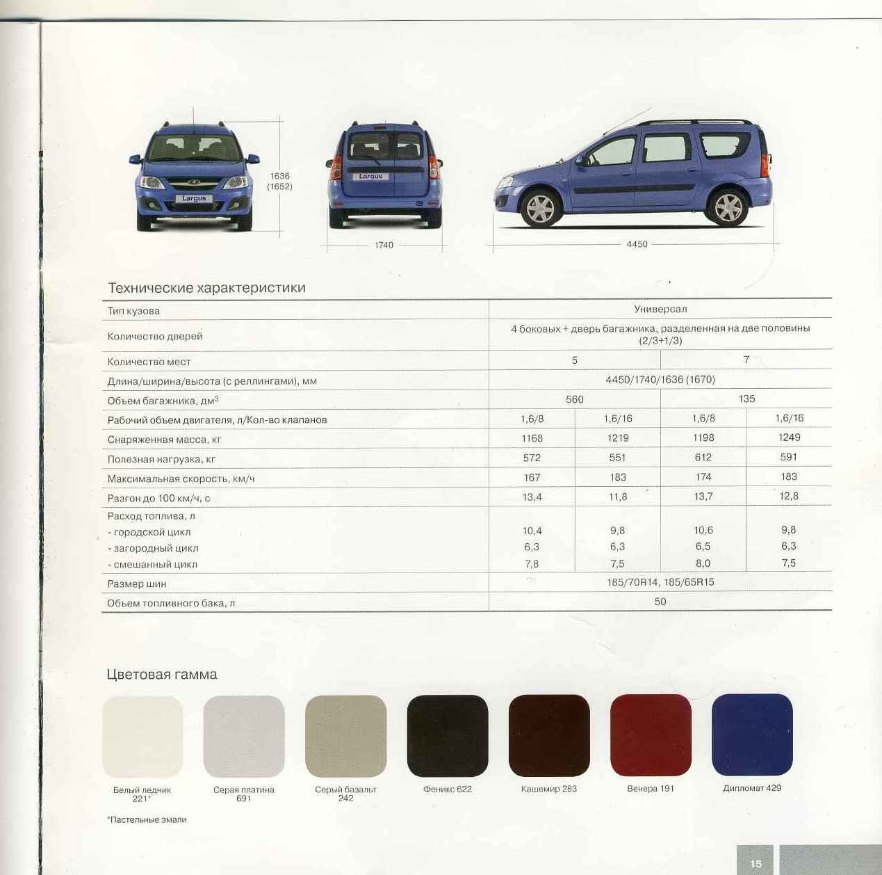 Размеры автомобилей различаются незначительно, думаю, ошибку можно отнести к погрешности измерений. Ларгус: д4470, в1636(1670), ш1750 Logan MCV: д4473, в1640(1674), ш1740 А вот с расходом топлива действительно непонятки... Ларгус (8кл): г.12,3/т.7,5/к.9,3 Евро ? Renault Logan MCV (8кл): г.10,4/т.6,3/к.7,8 Евро 3 Dacia Logan MCV (8кл): г.10,2/т.6,1/к.7,6 Евро 4 При том что данные на Рено взяты из украинской брошюры, я полагаю, у них там топливо не лучше... Разница между Dacia и Renault, получается, повидимому, из Евронорм... Я написал письмо через форму обратной связи на сайте Автоваз, с вопросом на счет расхода топлива, но ответа так и не получил, они, видимо, не сочли нужным отвечать. Еще есть путаница с передаточным числом главной пары в коробке передач, что ставят на Dacia и Renault не известно, может быть здесь кроется ответ по поводу расхода топлива... но опять же не ясно почему это повлияло и на городской цикл. Еще путаница с лошадинными силами, у всех написано 64кВт - 90л.с., хотя, 1кВт=1.36л.с., итого должно получиться 87л.с. При этом в европе в зависимости от года выпуска и, соответственно, экологических норм, этот двигатель имеет следующие показатели: Евро3=90л.с., Евро4=87л.с., Евро5=84л.с. Размер колёс одинаков у всех автомобилей 185/65/R15 Редактировалось: 4 раз (Последний: 8 сентября 2012 в 12:53) | ||||||
