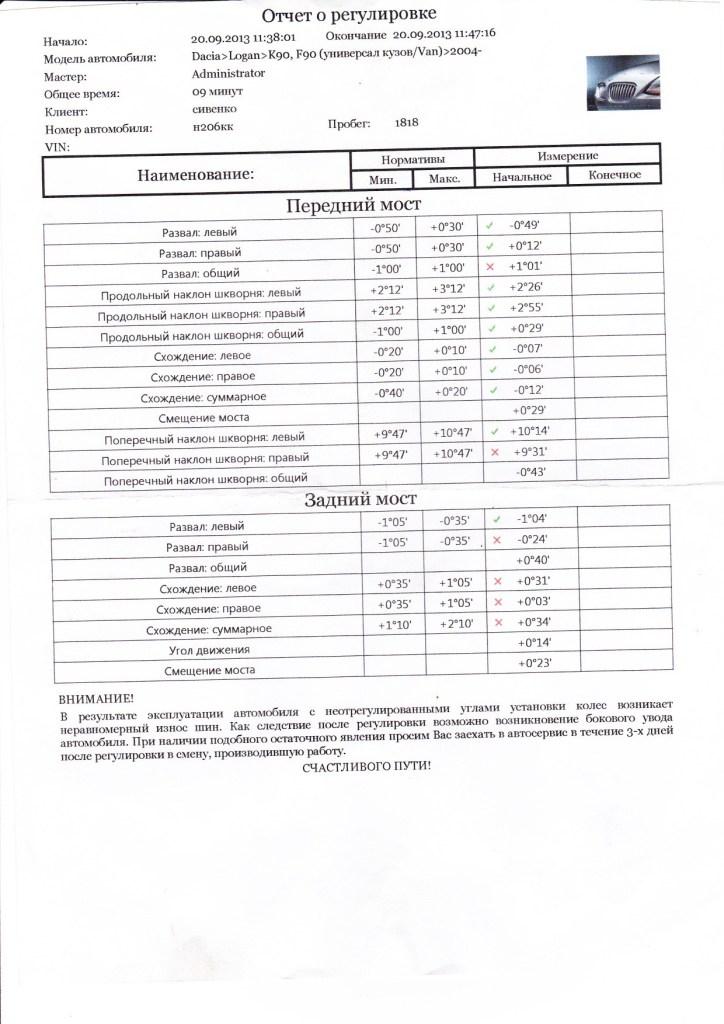 При покупке Ларгуса, попросил дать распечатку углов. Сейчас пробег около 4000 км, вроде никуда, не тянет, да и неравномерного износа вроде не заметно. Хотя пробег конечно - мизерный. Для статистики - распечатка ОД (Бухарестская 22) нового Ларгуса: ![]() Редактировалось: 1 раз (Последний: 21 сентября 2013 в 22:06) | ||||||||