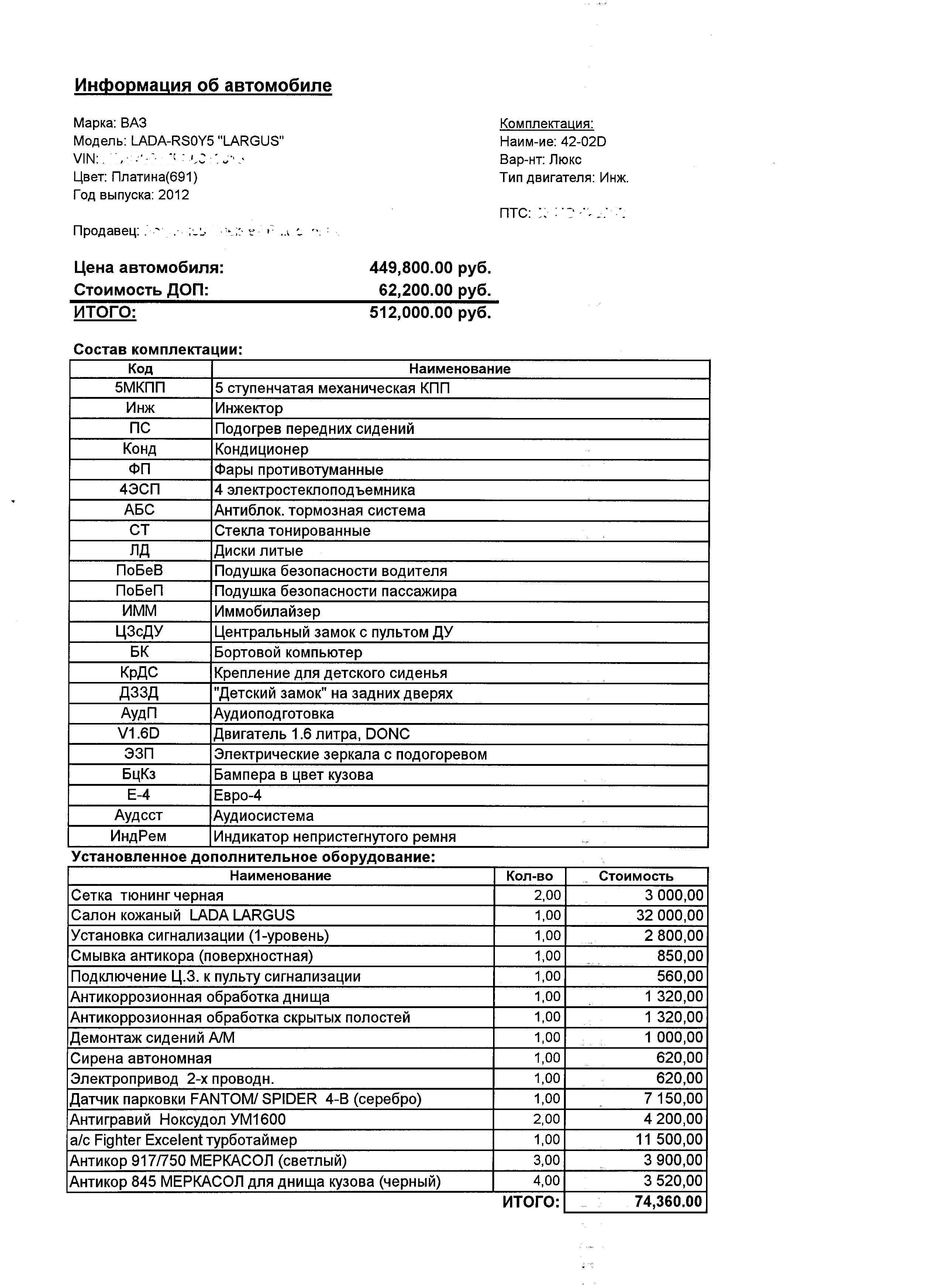"Мега Моторс" на своей страничке вКонтакте 3 августа предлагал: "7 местный люкс 449 800 руб + 60 000 руб допа список допа: антикор жидкие подкрылки защита картера парктроники сигнализация музыка коврики модуль стеклоподъемников можно сказать есть всё!" http://vk.com/topic-41250184_26693558?post=17 Вопрос о том что, "Ларгус в заводской комплектации уже содержит: антикор, подкрылки, защиту картера, музыку (в люксовой версии), эл/стеклоподъемники (в люксовой версии)" был сразу модератором стёрт! Потом вопрос опять повторился и теперь висит без ответа. Видно админ странички прозевал там дисскусию :) | ||||||||