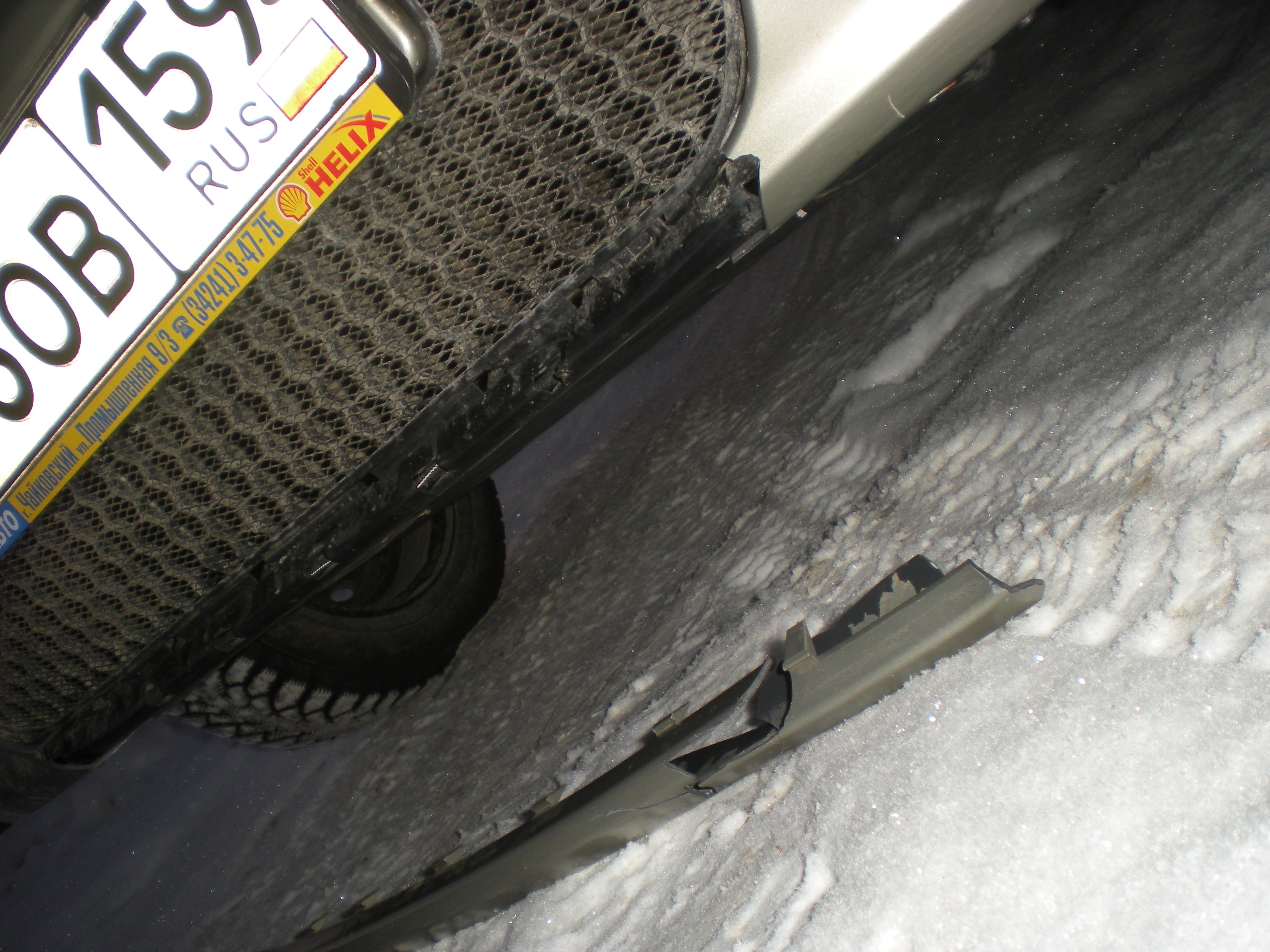 камушек замороженой земли подкараулил в сугробе, если б не -25 за бортом может бы и обошлось... а так много-много маленьких кусочков от нижней части