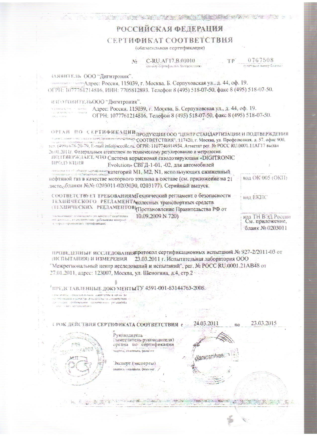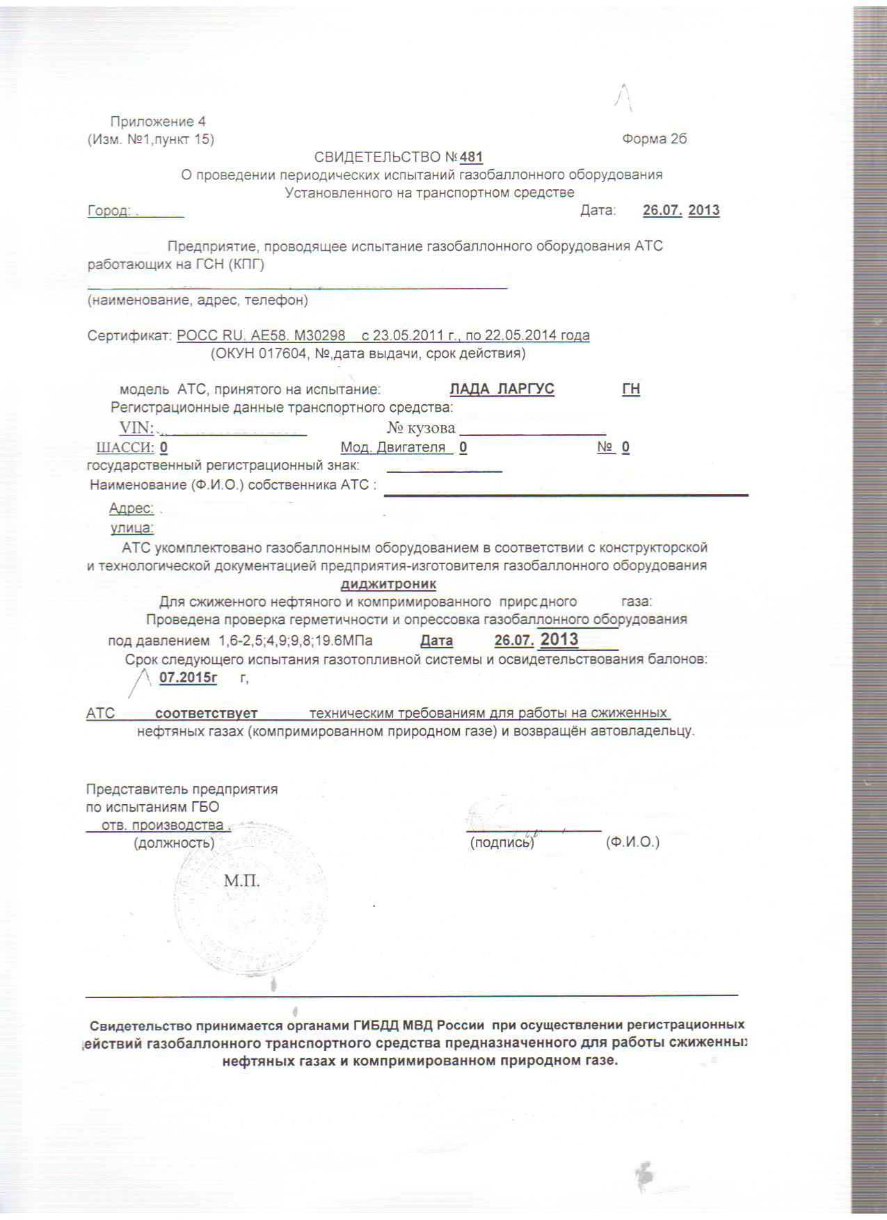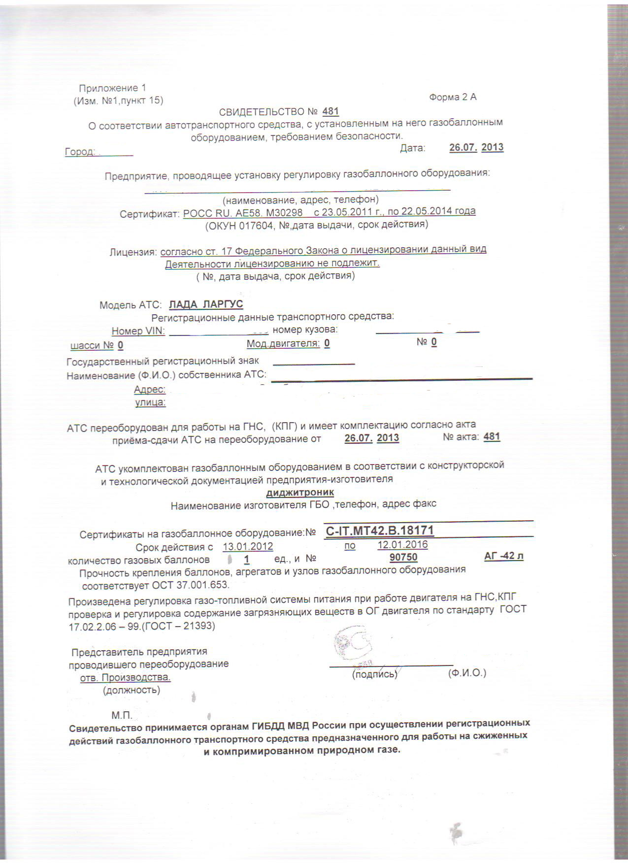 Сам задавался этим вопросом к сожалению вас ввели в заблуждение эти документы можно возить с собой и они реально являлись бы подтверждением легальной установки если оборудование установлено до какого то числа 2007 г до выхода регламентирующего письма - я так на соболе и ежжу. Сейчас-же нужно оформлять переоборудование автомобиля и делать запись об этом в птс и техталоне. Делаетсяэто так 1. Идете в гибдд говорите что хотите газ - вам дают разр4шение на переоборудование 2. Имея разрешение устанавливаете у выбранной фирмы - вам дают документы типа отсканированных вами 3. С документами идете в гибдд для внесения изменений и если все нормально то пьете шампанское. Но у нас нормально не будет в вашем скане сертификата на оборудование есть ссылка на 21 страницу с перечнем транспортных средств - догадайтесь будет ли там ларгус - правильно гибдд вам отказывает и мы с отказной бумажкой делаем техэкспертизу на основании которой и вносите изменения в конструкцию и ездите где хотите | ||||||||||||||||||||||||||||||
