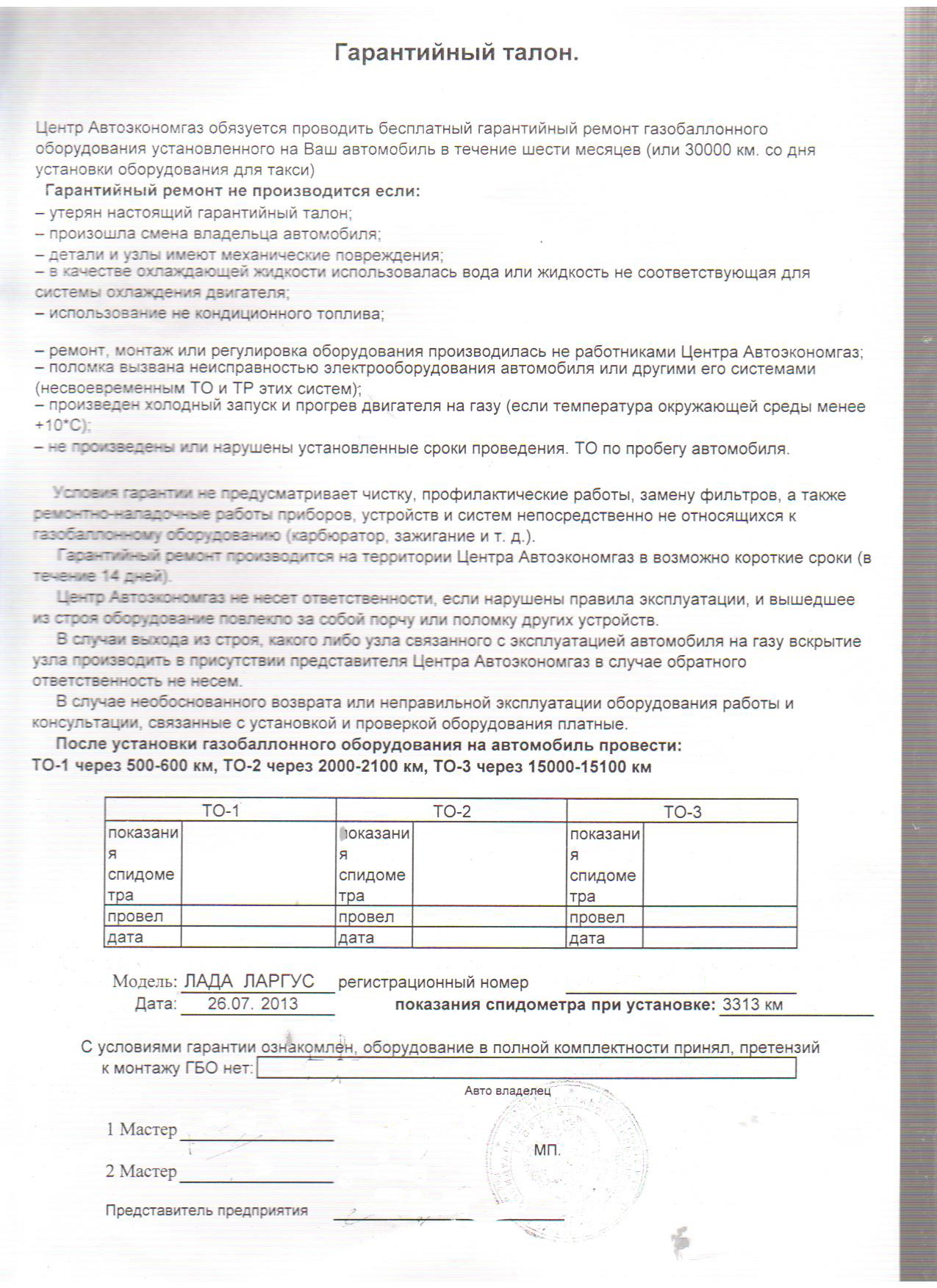 Ларгус, 7 мест (3й ряд постоянно отсутствует), пробег на момент установки ГБО 3313км. Стоимость работы 19000р, время – с 9 утра до 15 часов плюс съезили заправили 15 литров и немного времени для калибровки оборудования. Перед установкой в фирме объяснили рассказали показали сертификаты, гарантии, как будет работать установка, где лучше не заправляться, рекомендации по замене фильтра и прочее. Проехав около 200км – различийс бензином в динамике, приемистости с не заметил (стиль езды - мягкий старт, трасса – не более 110км), по городу были моменты необходимости стартануть вырваться – пожалуйста без проблем, считаю Ларгус в основном для размеренного вальяжного вождения, а не активного… - да и какая тут динамика – машинка и 5тыщ не пробежала. В гарантийнике можно прочитать о проведении ТО. Такой вопрос имеется – надо ли иметь какое-нибудь удостоверение водителю к оборудованию чтобы поездить без проблем по Украине? Все документы, которые выложил на просмотр – сказали возить с собой. Координаты фирмы установщика стер, (в Шахтах Ростовской обл) кому нада скину в личку. Фото документации и установленное ГБО: Прикрепленные файлы: